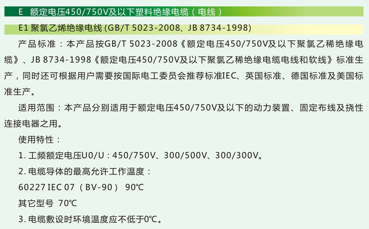 一、產品標準  本產品按GB/T5023-2008《額定電壓450/750V及以下聚氯乙烯絕緣電纜》、JB8734-1998《額定電壓450/750V及以下聚氯乙烯絕緣電纜電線和軟線》標準生產,同時還可根據用戶需要按國際電工委員會推薦標準IEC.英國標準、德國標準及美國標準生產。