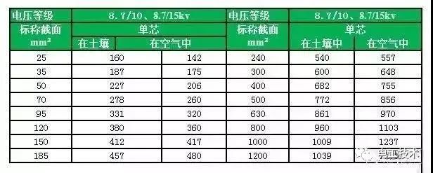 YJV、YJV22電壓在8.7/10、8.7/15kv電纜載流量表