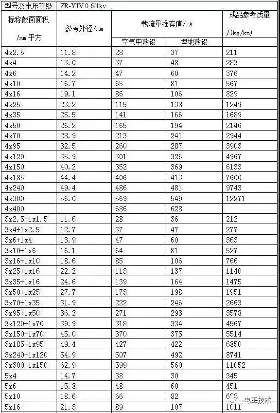 常見電纜的載流量一覽表